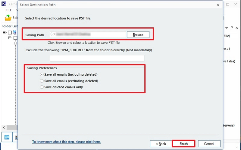 Step 8: Click Browse and provide the saving path for the resultant PST file. Choose any option from Saving Preferences accordingly. Click Finish.
