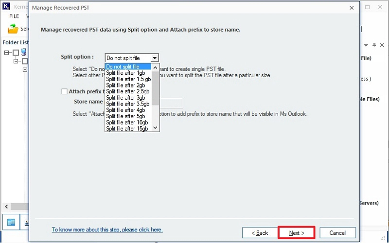 Step 7: Now, manage the large resultant PST data using the ‘Split’ option, if necessary. Click Next.